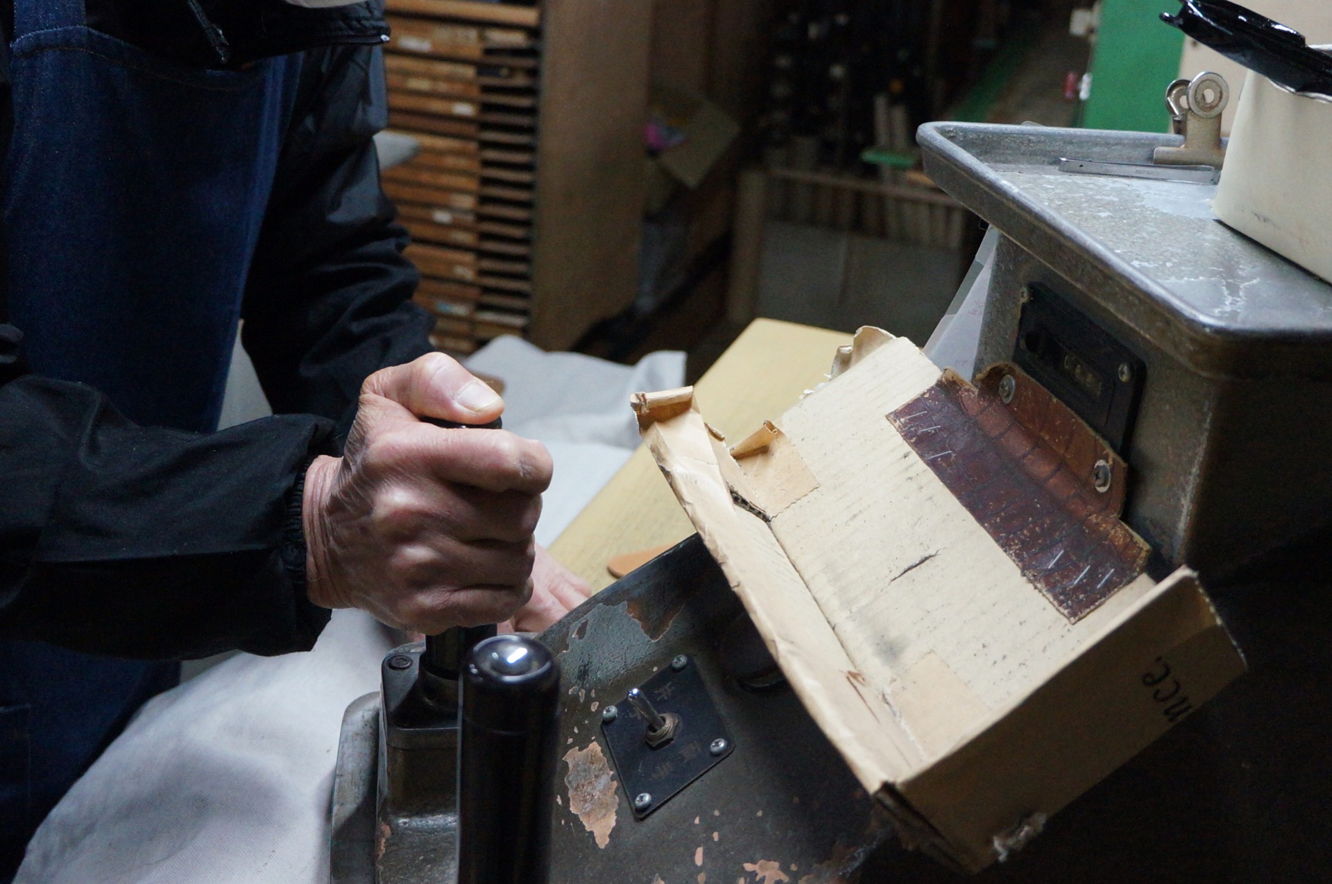 タガネを使用し、一つひとつ手作業でレザーを型抜きします。その際にレザーに傷がないか、隅々までチェックを行います。帆布などの布生地を裁断する場合は、専用のナイフを使用し、丁寧に裁断します。傷やほつれ、完成後の製品がより美しいものになるよう細心の注意を払いながら作業を行います。
